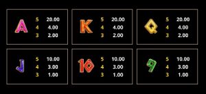 Low-paying symbols: The low-paying symbols are the card suit numbers, namely 9, 10, Jack, Queen, King and Ace. These pay between 0.2x and 0.4x your bet for five identical symbols on a single spin.