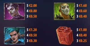 Medium-paying symbols: The weapons and the characters with the blue, purple and green backgrounds are the medium-paying symbols. These pay out between 0.8x and 2x your bet for five identical symbols on a payline.